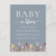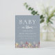 Une belle bordure florale d'aquarelle fleur sauvage décore le bord inférieur de cette invitation à baby shower boho tendance. Les mots "Baby in florom" apparaissent dans les polices serif et script, avec des swashes avant et après le script. Personnalisez le texte avec le nom de la future maman et les détails de la douche en blanc sur un arrière - plan bleu poussiéreux.