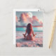 Belle femme méditant sur une plage de sable blanc et de verre de mer brillant. Nuages roses et bleus duveteux et eau bleu pâle.