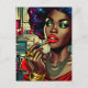 Art de l'air cool représentant une bande dessinée colorée de style bande dessinée jolie femme afro-américaine mettant du rouge à lèvres dans la cuisine, femme de couleur de style rétro.