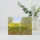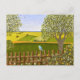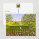 Une carte avec une belle image d'une scène naturelle : un oiseau perché sur une clôture patinée, des fleurs sauvages poussant autour de la clôture, un agriculteur sur un tracteur, travaillant sa terre, des arbres avec des feuilles et des terres agricoles aux couleurs variées. Œuvre originale de W.B.