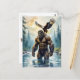 Carte postale Bigfoot. Un Sasquatch musclé avec un aigle qui atterrit sur son épaule pendant qu'il marche à travers une rivière dans une forêt.
