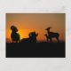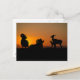 Un petit troupeau de moutons de corne s'installe pour la nuit. Leurs silhouettes se dressent contre le coucher de soleil éblouissant derrière elles. L'art informatique de Kathie Miller.