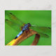 Une libellule bleue est assise tranquillement sur une lame d'herbe contre un arrière - plan vert.