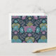 Cette carte postale présente des fleurs dans les tons violet, bleu et vert olive entourées de frondes de fougères violettes muettes et de feuilles sur un arrière - plan bleu foncé.