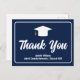 Cette moderne carte de fin d'études personnalisée bleu marine et blanc présente un remerciement manuscrit élégant au-dessus du nom de votre lycée ou université pour la promotion 2025. Personnalisez avec votre nom sous la casquette de diplômé pour des cartes de remerciement personnalisées pour diplômés.