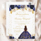 Cette invitation d'anniversaire élégante et glamour pour une Quinceañera présente une belle princesse aux cheveux foncés avec un diadème et une robe de bal bleu marine. Le texte combine une écriture manuscrite et des polices sans empattement modernes pour un look classe et sophistiqué. Les arrangements floraux et les confettis dorés créent le mélange parfait de rustique et de chic.