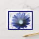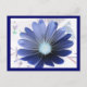 Cette jolie carte postale présente une photo magnifiquement détaillée d'une fleur de marguerite africaine. La photo a été numériquement modifiée, ce qui a donné une fleur bleue éclatante. Le centre de la fleur brille le plus brillant, tandis que tous les pétales ont une couleur bleu profond qui s'estompe à un bleu pâle plus loin, ils s'éloignent du centre de la fleur. Il y a un cadre bleu foncé autour de l'extérieur de la photo.