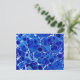 Carte postale bleue marbrée : ce magnifique design coloré est un exemple de papier marbrée vintage réinventé et revitalisé. Les couleurs bleu et blanc parsèment le joli design dans des tons et des tailles aléatoires comme l'eau et la mousse de mer. Le marbrage en papier est une méthode ancienne de conception de surface aqueuse, qui peut produire des motifs semblables au marbre lisse ou à d'autres pierres. Les motifs sont le résultat de la couleur flottée sur l'eau ordinaire ou une solution visqueuse connue sous le nom de taille, puis soigneusement transférés sur une surface absorbante, comme le papier ou le tissu. Pendant plusieurs siècles, les gens ont appliqué des matériaux en marbre sur une variété de surfaces. Il est souvent employé comme une surface d'écriture pour la calligraphie, et en particulier les couvertures de livres et les documents de fin dans la reliure et la papeterie. Une partie de son attrait est que chaque impression est un monotype unique qui est extrêmement agréable à l'oeil.