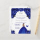 Cette invitation d'anniversaire élégante et glamour pour sweet sixteen présente une belle princesse aux cheveux blonds dans une robe de bal bleu foncé. Le texte combine une écriture manuscrite et des polices modernes sans serif pour un look classe et sophistiqué. Les arrangements floraux, le papillon et les confettis argentés créent le mélange parfait de rustique et de chic.