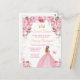 Cette invitation élégante et glamour pour un sweet sixteen anniversaire présente une belle princesse aux cheveux blonds vêtue d'une robe de bal rose pastel. Le texte combine une écriture manuscrite et des polices sans serif modernes pour un look classe et sophistiqué. Les arrangements floraux, le papillon et les confettis dorés créent le mélange parfait de rustique et de chic.
