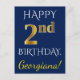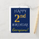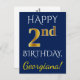 Ce design simple et personnalisé de carte postale d'anniversaire comporte le message "HAPPY 2nd BIRTHDAY", avec le "2nd" ayant une apparence fausse or. L'avant comporte également un nom personnalisé et un arrière - plan bleu. Le dos contient un message d'anniversaire personnalisé, ainsi que l'adresse personnalisable du destinataire de la carte postale d'anniversaire. Il pourrait être envoyé à quelqu'un qui célèbre son deuxième anniversaire. [~Z0000074]