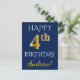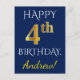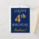Ce design simple et personnalisé de carte postale d'anniversaire comporte le message "HAPPY 4th BIRTHDAY", avec le "4th" ayant une apparence fausse or. L'avant comporte également un nom personnalisé et un arrière - plan bleu. Le dos contient un message d'anniversaire personnalisé, ainsi que l'adresse personnalisable du destinataire de la carte postale d'anniversaire. Il pourrait être envoyé à quelqu'un qui célèbre son quatrième anniversaire. [~Z0000074]