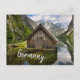 Photo carte postale d'un cabine en bois à l'intérieur du lac Obersee entouré par de belles hautes Alpes dans un paysage de Bavière à la pointe sud-est de l'Allemagne, près de la frontière avec l'Autriche avec le texte 'Allemagne'.