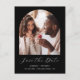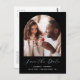 Cette carte postale simple et minimaliste Save the Date présente une photo en arc au-dessus des mots "Save the Date" dans un élégant script d'écriture manuscrite blanche, suivie des noms du couple, de la date mariage et de la ville en caractères sans serif sur un arrière - plan noir. Ajoutez votre adresse de retour et des détails supplémentaires au verso, ainsi qu'un code QR pour aider les clients à visiter votre site Web mariage.