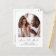 Cette simple et minimaliste carte postale Save the Date présente une photo en arc au-dessus des mots "Save the Date" dans un élégant script d'écriture noire, suivi des noms du couple, date mariage et ville en sans serif police sur un arrière - plan blanc. Ajoutez votre adresse de retour et des détails supplémentaires au verso, ainsi qu'un code QR pour aider les clients à visiter votre site Web mariage.