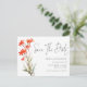 Boho Red Fleurs sauvages QR Code Script Enregistrer La Date. Une carte postale pratique pour demander à vos invités d'enregistrer votre date. Ajoutez votre code QR à votre site Web mariage ou supprimez-le si vous n'en avez pas besoin. Un design floral minimaliste avec Save The Date dans un script moderne.Le reste du texte que vous pouvez facilement personnaliser. Les couleurs du texte et de l'arrière - plan peuvent être modifiées si vous le souhaitez via l'option personnaliser.
