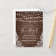 Un thème vintage classique dans un style moderne ! Ce design est composé d'un arrière - plan en bois rustique avec des lampes à cordes en haut et d'une belle dentelle vintage dans les coins inférieurs. Le texte apparaît au milieu avec "le mariage de" en lettres de script pour ajouter cette touche extra élégante ! Parfait pour les mariages en plein air au printemps, en été ou en automne. Customisez cette conception en cliquant sur le bouton "Personnaliser" et en tapant dans les zones de texte. N'oubliez pas de consulter la large gamme de formats, de textures et de formes de papier que Zazzle a à offrir ! Objets correspondants disponibles dans notre magasin.