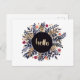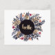 L'illustration est faite d'aquarelles et de gouache sur papier. Indigo, ocre et orange feuillage et fleurs avec un bonjour doré écrit à la main au milieu.