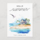 Connectez-vous avec les clients des excursions cet été avec cette carte postale "bonjour été" accrocheuse qui comprend une maison de plage, l'océan et les mouettes.