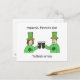 Un amusant couple de caricaturistes vêtu de casquettes verts St. Patrick's Day et de chandails avec des shamrocks, se tortillant les uns les autres avec des pintes de trucs noirs.