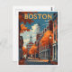 A retro-style travel poster captures a charming autumnal street scene in Boston, with historic brick buildings and vibrant orange-leafed trees under a blue sky, and "BOSTON" boldly displayed at the top.