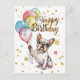 Un mignon Bouledogue Français tient des ballons d'anniversaire et souhaite un joyeux anniversaire.
