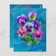 Bouquet aquarelle coloré de fleurs de violettes pensées sur fond aquarelle bleu et inscription MERCI au verso.