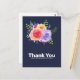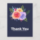 Une carte de remerciement pour une fête avec un beau bouquet de roses à l'aquarelle avec des brindilles, des feuilles et des branches réunies dans un arrangement floral coloré. Fond bleu marine. Message personnalisé au verso.