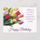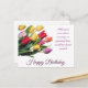 Exprimez vos vœux d'anniversaire les plus chaleureux avec cette carte postale d'anniversaire personnalisable au bouquet de tulipes élégant. Avec un magnifique bouquet de tulipes multicolores sur un fond blanc simple et élégant, cette carte postale vous permet de personnaliser le texte "Joyeux Anniversaire" et d'ajouter votre propre message sincère. Le design de bon goût et les options personnalisables font de cette carte postale un choix parfait pour partager votre affection et votre considération le jour spécial de quelqu'un.