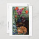 Carte postale d'art avec le tableau Bouquet et un chat (1919) de l'artiste française Suzanne Valadon (1865-1938). Portrait de son propre chat tabby orange, Raminou, avec un vase en verre bleu de coquelicots rouges, à côté du rideau.