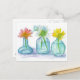 Une jolie carte postale décorée de trois bouquets de marguerite avec marguerites blanches, jaunes et roses dans de petits vases en verre peints en aquarelle.