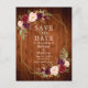 Elégante aquarelle Bourgogne Floral Enregistrer la date Faire-part Mariage La carte postale comprend des roses bordeaux, des roses roses roses, des roses rouges et de la verdure sur un cadre géométrique doré. Bois rustique.