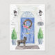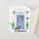 Annoncez votre nouvelle adresse avec notre faire-part élégante avec un Bouvier des Flandres, une porte d'entrée bleue, un tapis de bienvenue, une ardoise, des topiaires et une couronne fleurie posée sur un arrière - plan en brique grise.