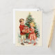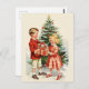 Lovely retro vintage Christmas illustration of a boy and a girl giving each other presents in front of a snowy Christmas tree.