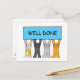 Quatre chats de dessins animés de différentes couleurs brandissant un panneau bleu vif qui dit "Bien fait".