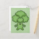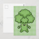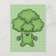 Brocoli de dessin animé vert mignon avec un visage heureux adorable. Le fond est un motif gingham vert et blanc.
