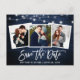Script de brosse moderne, Bois bleu rustique et lumières à cordes, Enregistrer la date Fiançailles Couple 3 Photo Carte Postale