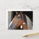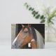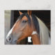 Carte postale avec photo de fond d'un cheval brun avec un blaze blanc et une crinière noire et blanche.