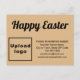 Joyeux Pâques ! Je vous souhaite une Pâques remplie d'espérance, de foi, de joie, d'amour et de paix ! Un jour férié et une saison pour fêter ce mars ou avril et pour annoncer également votre entreprise. Carte postale brune pâle avec accueil de Pâques que vous pouvez customiser en téléchargeant votre logo d'entreprise et en tapant votre nom d'entreprise, adresse, numéro de téléphone, e-mail et site Web ou page de médias sociaux. Customisez-le et utilisez-le pour accueillir vos clients ou clients cette Pâques et comme matériel marketing pour annoncer votre entreprise ou promouvoir votre marque. Carte postale de vacances personnalisable que vous pouvez utiliser pour développer la sensibilisation de marque. Veuillez vérifier l'apparence après avoir téléchargé le logo et tapé des textes. Si l'apparence vous plaît, vous pouvez passer votre commande maintenant. Si vous avez besoin de redimensionner et repositionner le logo et les textes pour s'adapter à cette carte postale de vacances, s'il vous plaît ajuster dans l'outil de conception. Vous pouvez également modifier le style de police, la couleur de police et la couleur arrière - plan dans l'outil de conception. Joyeux Pâques et vous souhaitant plus de ventes.