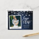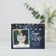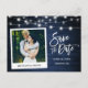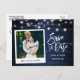 Script De Brosse Moderne, Style Caméra Instantané, Couple Photo Enregistrer La Date Photo Fiançailles Carte Postale - Rustic Country Blue Wood, String Lights