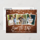 Script de brosse moderne, Bois rustique et lumières à cordes, Enregistrer la date Fiançailles Couple 3 Photo Carte Postale
