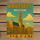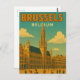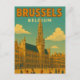 Celebrate the architectural grandeur of the Belgian capital with this elegant Brussels, Belgium Travel Card. This vintage-style illustration captures a grand public plaza, featuring a majestic Gothic tower with an intricate spire rising high above the surrounding historic buildings.