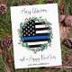 Envoyez Joyeux voeux de Noël à vos amis et votre famille avec cette carte de Noël unique en ligne Bleue Bleue Bleue Mince - Couronne de Noël dans un drapeau américain aux couleurs du drapeau de la police, design moderne noir bleu et blanc avec sainte et baies. Personnalisez avec le nom de famille. Cette carte de Noël de la police est parfaite pour les familles de policiers ou les cartes de Noël du service de police. DROIT D'AUTEUR © 2022 Judy Burrows, Black Dog Art - Tous droits réservés. Carte postale de Noël de la police budgétaire