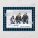 Unique, classique, tendance, joli et décoratif carte de vacances. Texte de joyeuses fêtes et place pour personnaliser avec une photo, le nom de famille (ou noms individuels) et message de votre choix, encadré par deux flocons de neige de couleur gris argent sur un fond à carreaux tartan de bûcheron Buffalo de couleur bleu foncé et noir.