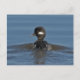 Un adorable canard Bufflehead féminin nageant loin de la caméra sur l'eau bleu foncé.