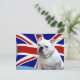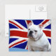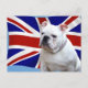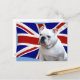 Montré est une image photographique d'un bulldog anglais blanc devant un drapeau britannique.