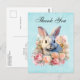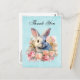Thank you postcard with a watercolor image. A white gray bunny rabbit surrounded by a garland of pink and peach roses. For bunny lovers and Easter themes and birthdays and showers.