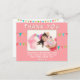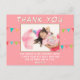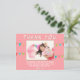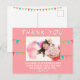 Cute bunting flags pink birthday photo thank you postcard. Thank your guest for coming to your child`s birthday party! The design has colorful birthday party bunting flags and a photo in a frame on a pink background with white spots - insert your photo into the template. Change the thank you message if you want and the child's name.