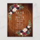 Elégante aquarelle Bourgogne Floral Enregistrer la date Faire-part Mariage La carte postale comprend des roses bordeaux, des fleurs bleues, des roses roses, des fleurs rouges et de la verdure sur un cadre géométrique doré. Bois rustique.