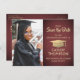 Partagez la joyeuse nouvelle d'une fête de remise de diplômes à venir avec photo personnalisée bordeaux et or enregistrer les invitations de la carte postale date. L'image et le libellé de ce modèle sont simples à personnaliser et les couleurs peuvent être changées avec l'outil de design Zazzle. Customisez-le avec le nom du diplômé, l'année de classe et d'autres détails de faire-part de votre choix. Le design marron rouge comprend un casquette de planche de mortier en faux papier, une calligraphie moderne élégante, une typographie vintage classique et une photo préférée, telle qu'une photo de haut rang ou une image de la cérémonie de début. Veuillez noter que l'or est imprimé en couleur et non en métal. Ces cartes de graduation élégantes sont une façon élégante de partager une fête spéciale avec votre famille et vos amis. Félicitations au diplômé !